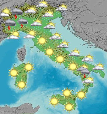 NORD: Sul Nord-Ovest mattinata molto variabile o localmente nuvolosa con possibili piovaschi sulle pedemontane Torinesi, pianure lombarde ed Emilia. Più sole sulle Alpi, Valle d’Aosta e Liguria. Nel pomeriggio instabilità sparsa con temporali anche moderati; localmente forti sul Piemonte, Valtellina, Milanese e Pavese. Piovaschi irregolari con alternanza di sole e schiarite sulla Valle d’Aosta e Lombardia. Più sole sulla Liguria. In serata rovesci e possibili temporali sulle pianure lombarde, Piacentino, Canavese e alto Piemonte. Schiarite e clima asciutto altrove.
